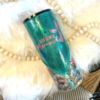 This stainless steel tumbler was lightly sanded and given a coat of green and gold spray paint. Once dried, a coat of epoxy was placed on the tumbler. While the epoxy was wet, fine and chunky glitter was added in a spiral around the tumbler. Once dry, another coat of epoxy was added over the glitter. While the second coat of epoxy was wet, thin strands of epoxy mixed with mica powders were added in spirals. Heat was then applied to the epoxy to move the colored strands around creating the "milky" look.
