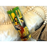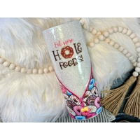 This stainless steel tumbler was lightly sanded and the floral/leopard vinyl pattern cut to size and applied to the surface. The floral cutout was taped to protect it, and the tumbler received a coat of black spray paint as a base for the glitter. Once dried, two layers of glitter were applied using modge podge. The protective tape was removed, and the first layer of epoxy applied. Once the epoxy was completely dry, the silver pin-stripping was applied around the floral cutout. The tumbler then received a second layer of epoxy to finish it up.